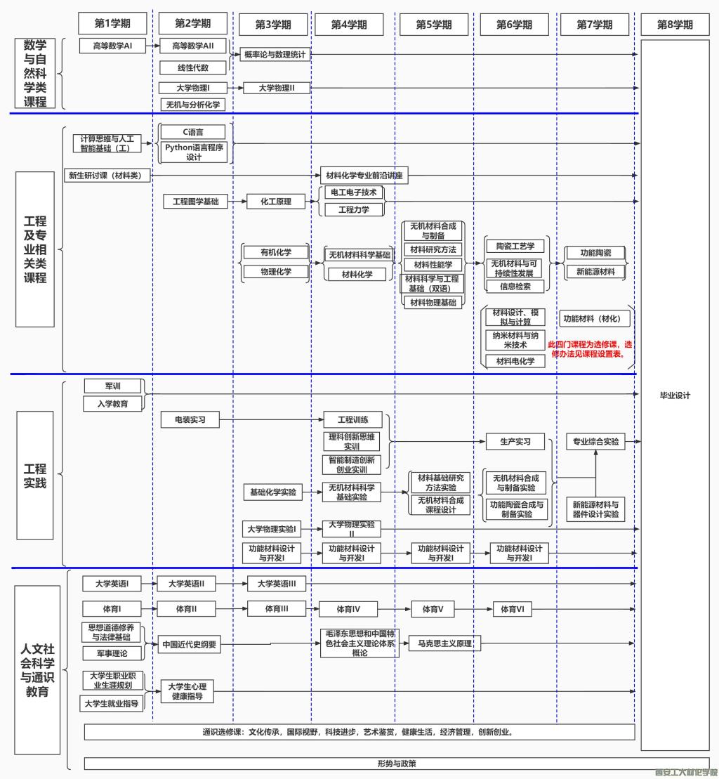 (2) 基础课程知识平台——拓宽专业口径,培养复合型人才。基础课程涵盖无机化学、工程力学、电工与电子技术、金工实习、无机材料科学基础、无机材料合成、材料性能学等课程。上述做法使学生基础扎实,具有材料、化学、化工兼顾的知识结构。