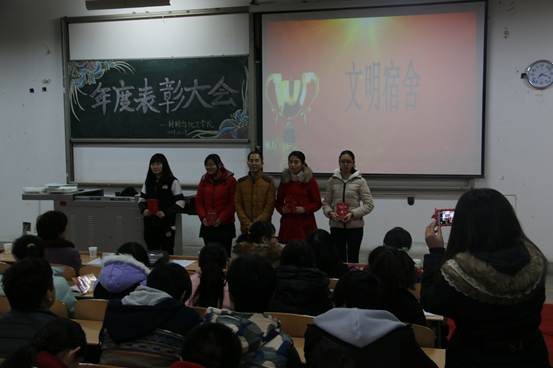 2013-2014学年评优获奖学生名单,由到场的老师为他们一一颁奖。颁奖之后,由三好班级130310班全体同学做班级风采展示,十佳大学生者李红娟作为学生代表发言。