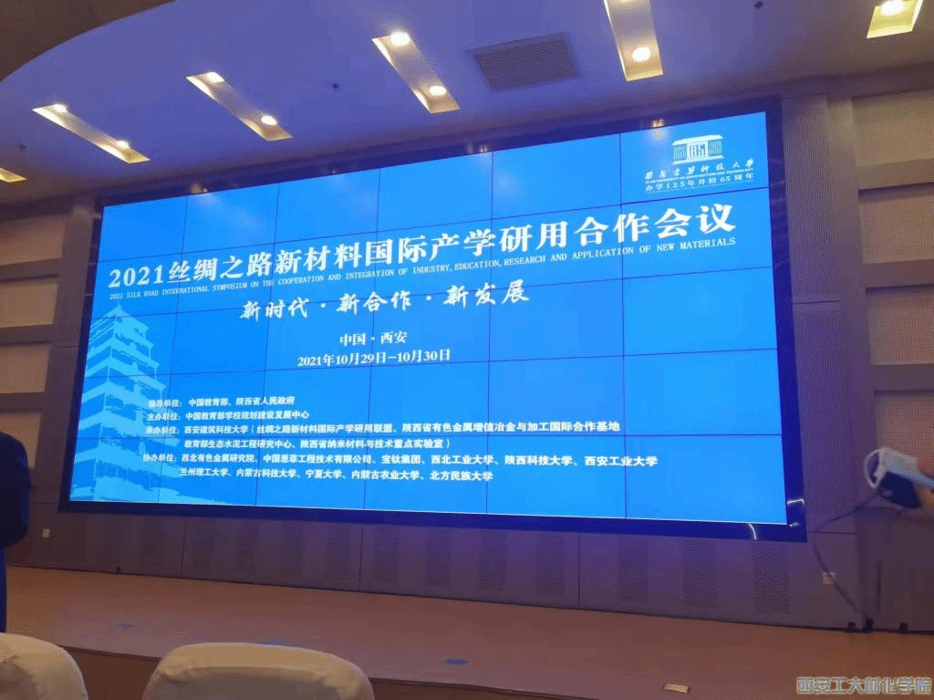 2021年10月29日至30日,由教育部、陕西省人民政府指导,教育部学校规划建设发展中心主办,西安建筑科技大学承办,西北有色金属研究院和西安工业大学等高校协办的2021丝绸之路新材料国际产学研用合作会议在西安开幕。西安科技大学党委书记朱晓渭、陕西省教育厅巡视员罗侃淳、大会主席余艾冰出席并致辞。来自中国、澳大利亚、德国、美国、新加坡、日本、巴基斯坦等国家的院士、专家、学者通过线上和线下方式参加。聚焦丝绸之路国际产学研用合作交流。