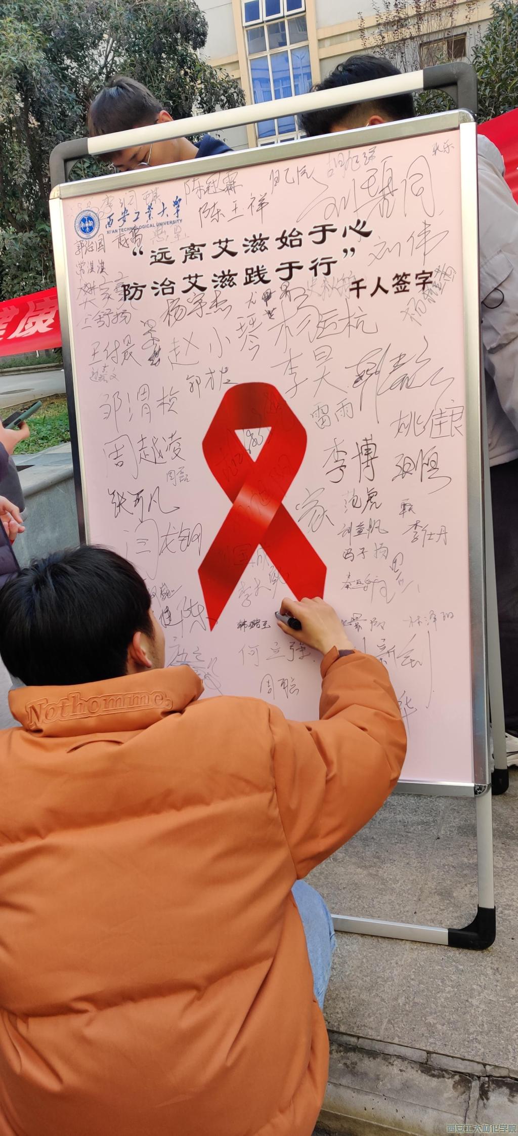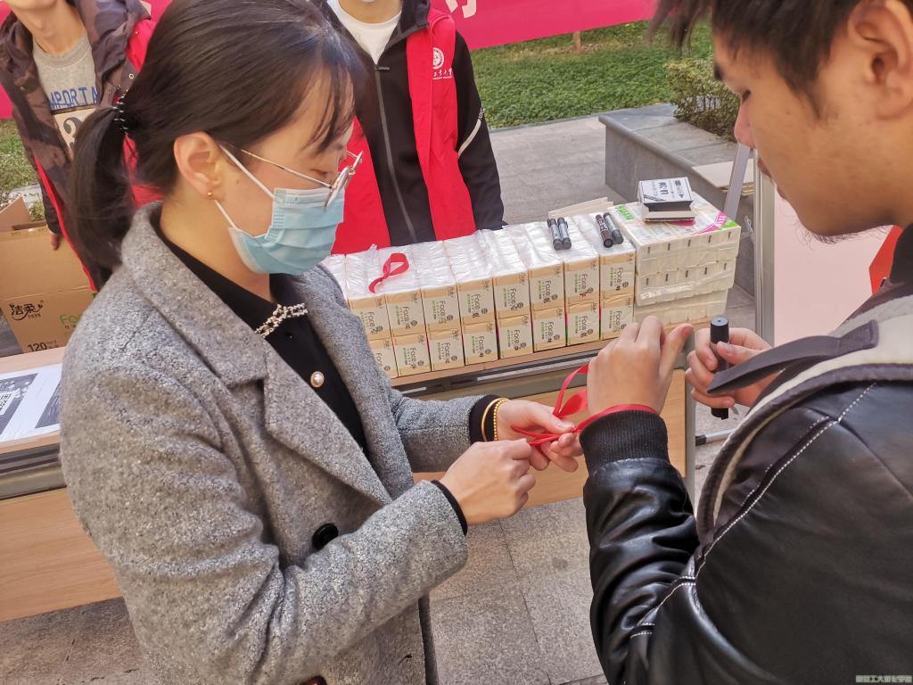 此次艾滋病防控宣传教育主题活动由“千人签字”、“情系红丝带”和线上知识竞赛组成。活动初始,在志愿者的组织下,同学们纷纷在“远离艾滋始于心 防治艾滋践于行”的标语板上签名,表达积极参与抗击艾滋病的决心,并积极倡导健康生活,践行文明风尚,身体力行,远离艾滋。随后,由志愿者为大家佩戴象征希望的红丝带,号召大家加入关爱艾滋病人的行列中,并代表青年学生将以红丝带为纽带,与艾滋病人紧密联系,共同抗击艾滋病的精神。最后,志愿者组织大家进行预防艾滋病线上知识竞赛,通过答题方式学习“防艾”知识,提高“防艾”意识,加强自我保护。