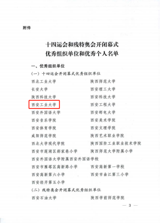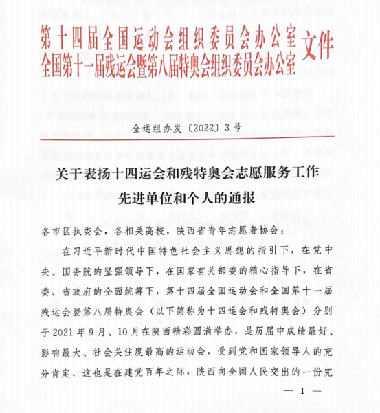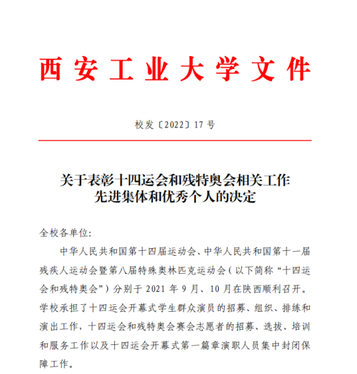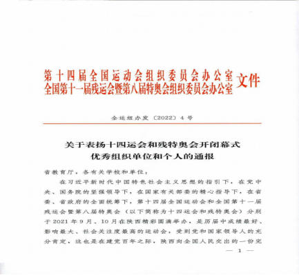 近日,第十四届全国运动会组织委员会办公室、全国第十一届残运会暨第八届特奥会组织委员会办公室联合印发了《关于表扬十四运会和残特奥会志愿服务工作先进单位和个人的通报》和《关于表扬十四运会和残特奥会开闭幕式优秀组织单位和个人的通报》,我校荣获“十四运会和残特奥会志愿服务先进单位”和“十四运会开闭幕式优秀组织单位”荣誉称号,多名师生荣获表彰。138开奖(中国)官方网站