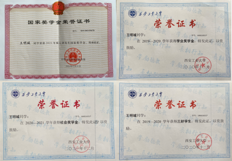 王明城同学,西安工业大学材料物理与化学专业2019级硕士研究生,在校期间学习成绩优异,获得了国家奖学金、一等学业奖学金、社会奖学金和三好学生等多项荣誉,以第一作者(导师一作,学生二作)发表了与自己课题相关的英文文章4篇,总IF>39。
