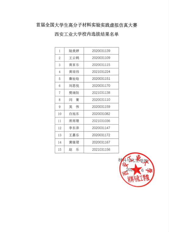 本次大赛面向全校学生,经过紧张激烈的理论考试和评委组评判,最终确定陆美婷、王云鹤等15位同学代表学校参加首届全国大学生高分子材料实验实践虚拟仿真大赛。