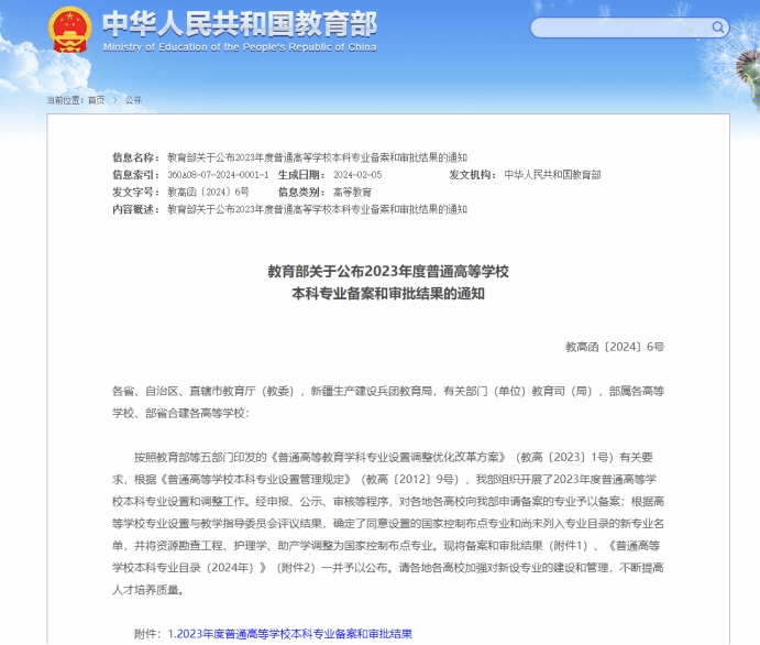 根据教育部下发《关于公布2023年度普通高等学校本科专业备案和审批结果的通知》(教高函〔2024〕6号),138开奖(中国)官方网站