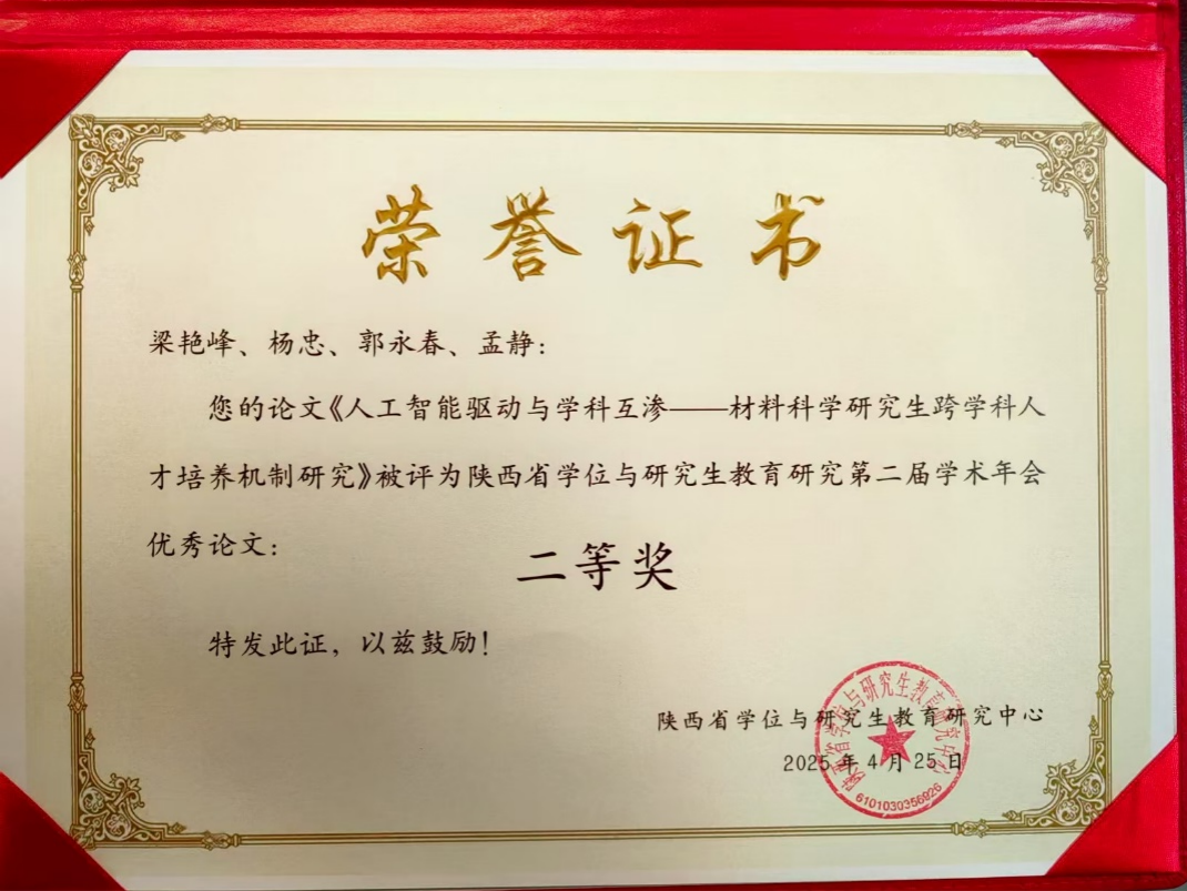 梁艳峰老师的论文《人工智能驱动与学科互渗——材料科学研究生跨学科人才培养机制研究》荣获征文二等奖,该论文为我校教师组唯一获奖。