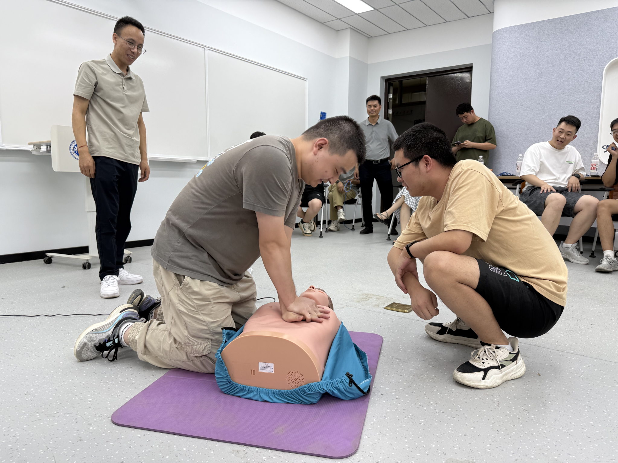 活动现场,应急物资使用操作、废液倾洒处置救援、乙醚起火应对、逃生结绳以及心肺复苏等多个演练环节有序开展。专业安全指导人员与医护人员现场示范讲解,师生们认真聆听后积极参与实操。从灭火器的规范使用、腐蚀性废液的科学处理,到火灾场景下的紧急扑救与疏散,再到实用结绳技巧和心肺复苏急救技能的练习,每个环节都高度还原实验室真实场景。师生们在演练中紧密配合,在实践操作与专家复盘指导中,快速掌握了各类科研安全应急技能。