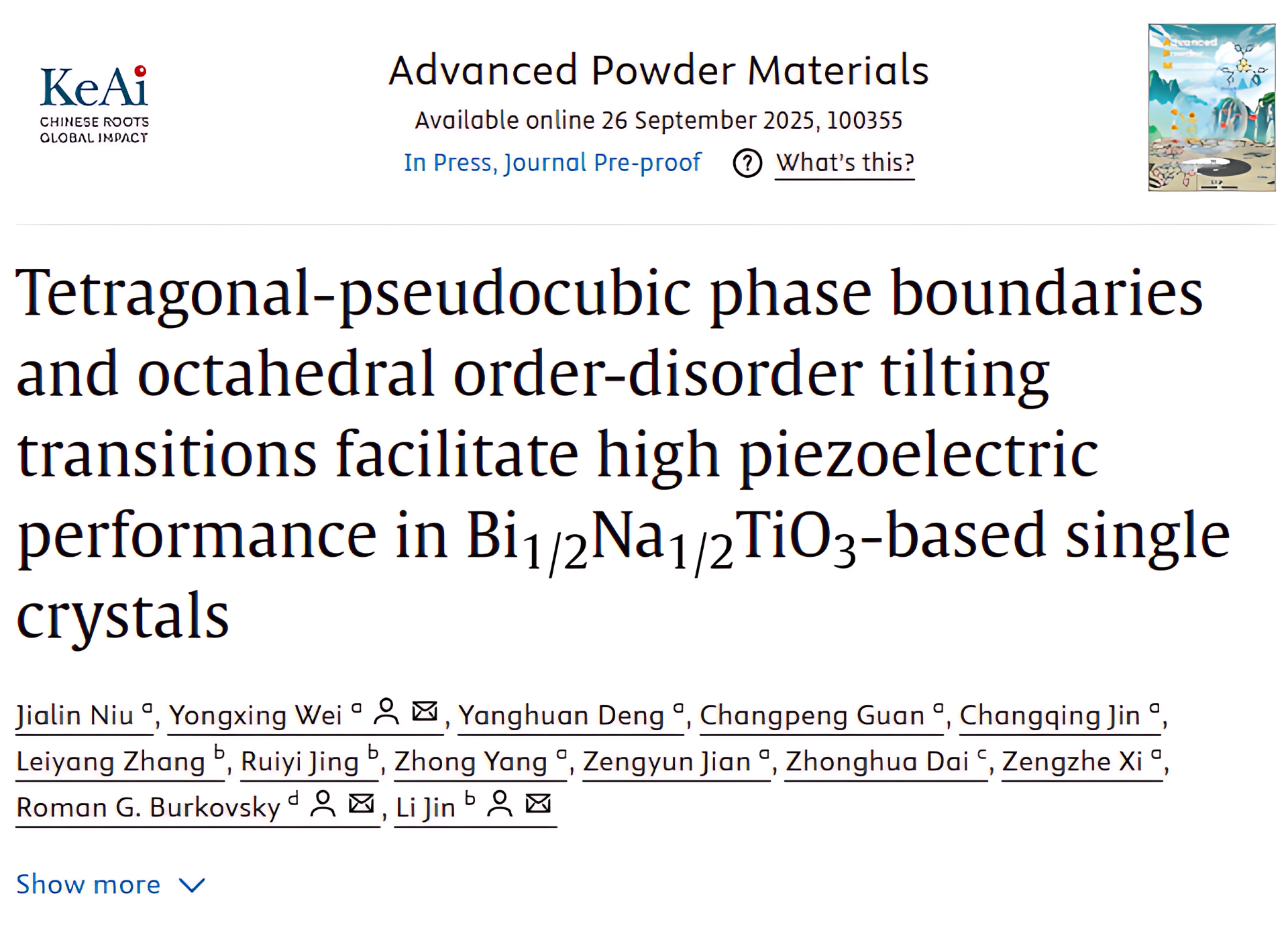 魏永星副教授研究团队联合西安交通大学靳立教授、俄罗斯圣彼得堡彼得大帝理工大学Roman G. Burkovsky副教授在国际顶级学术期刊《Advanced Powder Materials》(IF=24.9)上发表了题为“Tetragonal-pseudocubic phase boundaries and octahedral order-disorder tilting transitions facilitate high piezoelectric performance in Bi1/2Na1/2TiO3-based single crystals”学术论文,我校为第一通讯单位,2024级博士研究生牛佳林为论文的第一作者。