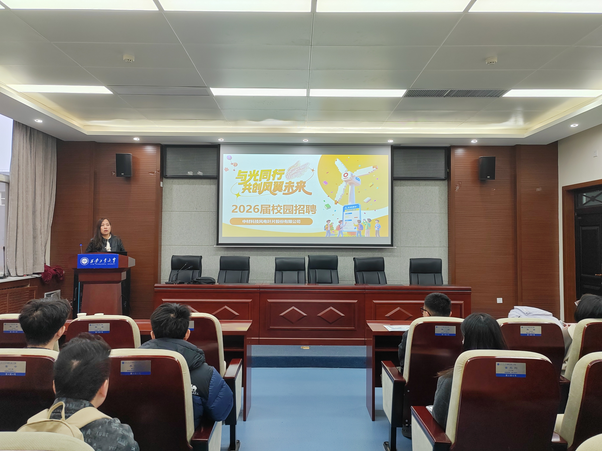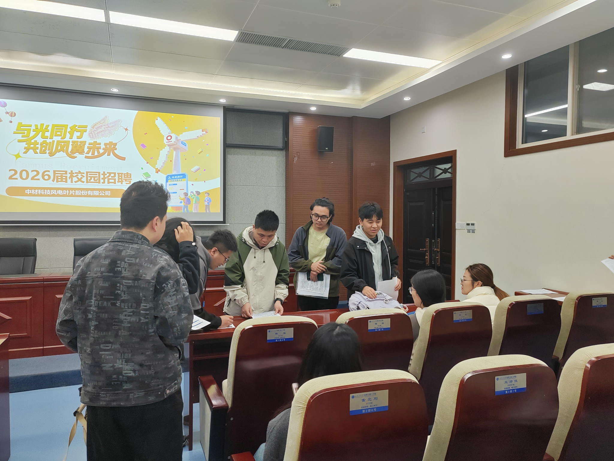 在工4-204举办中材科技风电叶片股份有限公司专场招聘会。现场气氛热烈,吸引了众多应届毕业生参加。