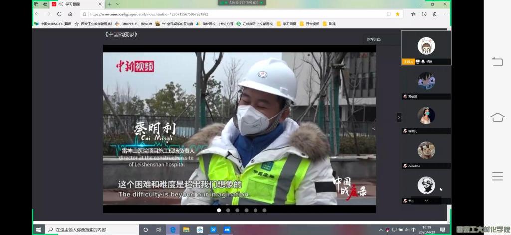 本次观影活动由支部副书记杨静主持。会议开始,全体党员观看影片。10天时间,一座总建筑面积3.39万平方米,可容纳1000张床位的医院正式落成。这是令人惊叹的中国速度!时间不等人,病毒不等人,我们用中国速度,进行着一场与时间持续赛跑的战“疫”!接着,支部书记段老师表示:大部分参与建设火神山医院的人,平均一天工作20个小时左右,除了睡觉吃饭,都在工作。数不清的渣土车进进出出,场面令人震撼。党员们看到突显中国力量的视频也展开积极交流。党员张欣怡谈到中国速度背后,是强大的国家实力,展现着中国特色社会主义制度的巨大优势。党员戈东谈到在疫情期间,不仅是雷神山、火神山医院的建成,国家在疫情期间更彰显出来中国的治理体系的优越性,无论医护人员、物资配备、人员协调、防控体系等等,都让我们看到了中国力量和中国速度,我们应该要自豪自己的祖国。本次观影活动到此结束。