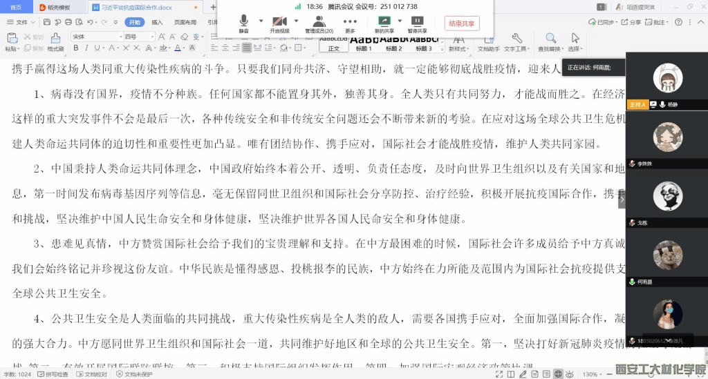 学生第三党支部通过线上学习的方式,组织学习有关习近平总书记谈抗疫国际合作的内容。支部书记段强老师以及支部全体党员参加此次组织生活会。