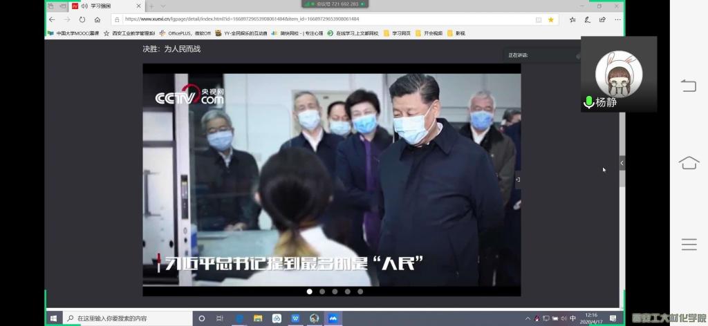 本次活动由支部副书记杨静主持。首先,一段不到五分钟的短片-《决胜:为人民而战》带全体党员一起回顾在这场艰苦卓绝的战疫中“人民”的分量。3万余工人从全国各地赶到武汉,火神山医院从开始设计到建成完工,历时仅十天;军队再次支援湖北的1200名医护人员到达武汉后,仅用50多个小时就开始接收第一批患者;截至三月十日,全国已有7436万党员自愿捐款;我国口罩日产达到1.1亿只。每个事例都在讲述人民力量的强大。战“疫”,为了人民;信心,来自人民;打赢,依靠人民。随后全体党员共同观看一部短片《习近平讲述的故事之共同战疫》。支部书记段老师表示突如其来的疫情是一场人类的共同的灾难,国际社会团结一致,共同应对才是正确的。观影后,全体党员间进行了交流,党员苏伯涵表示新冠肺炎疫情这场全球公共卫生危机,是对国际合作的考验。希望全球疫情早点结束。