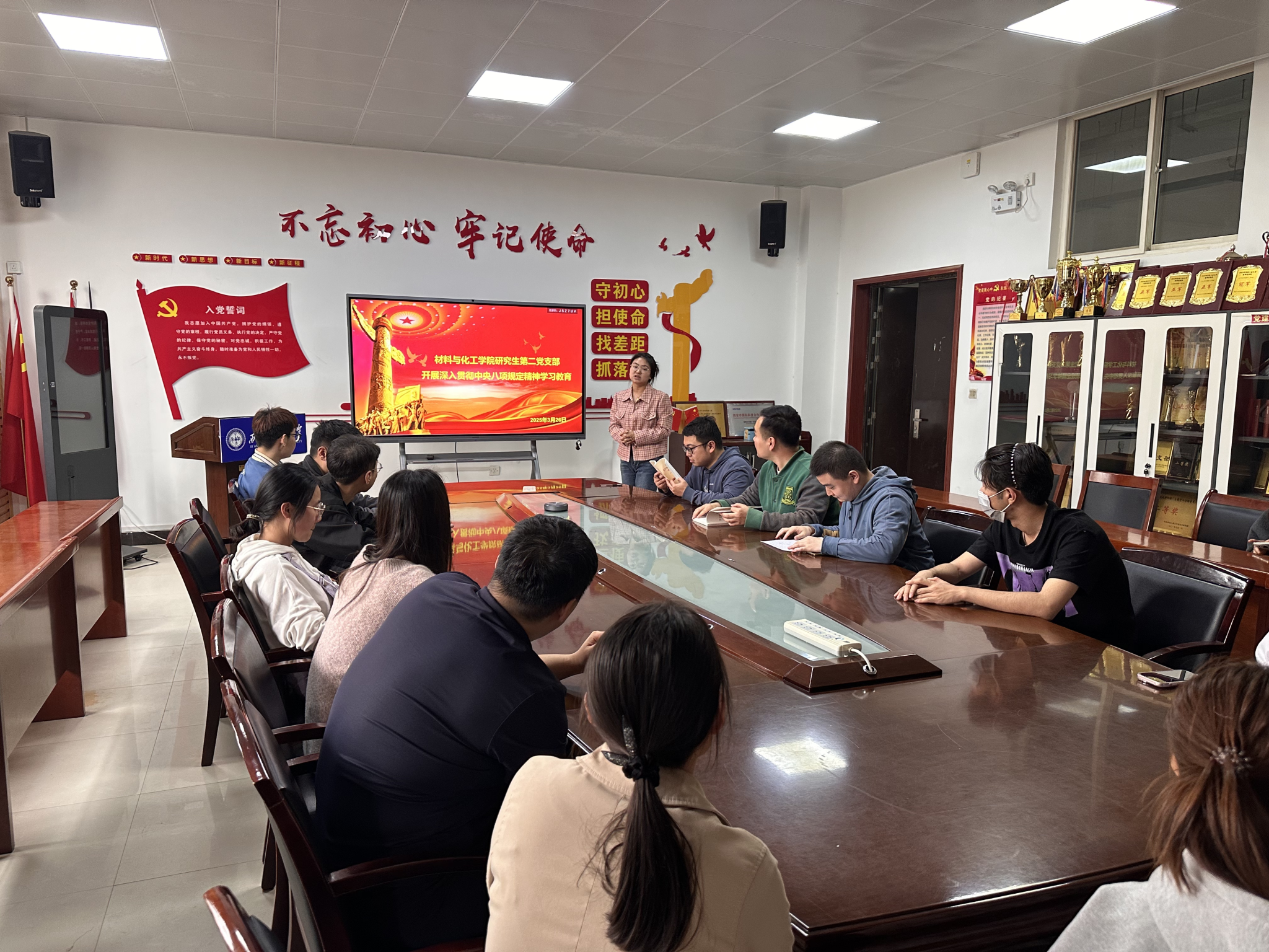 研究生第二党支部于3月26日在工3-410开展了深入贯彻中央八项规定精神学习教育,旨在引导全体党员深刻领会中央八项规定精神的内涵实质,切实增强廉洁自律意识,筑牢拒腐防变的思想防线。