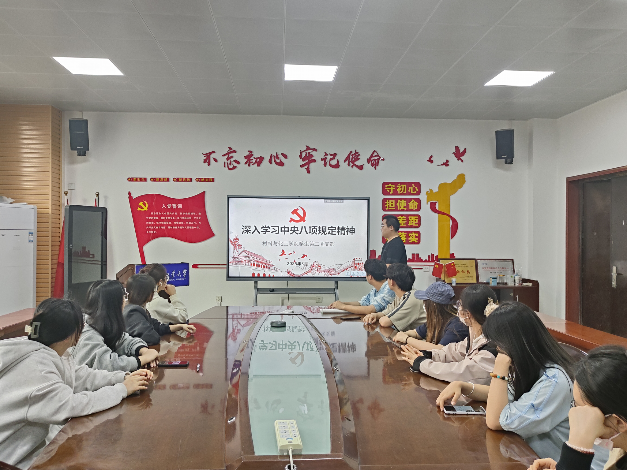 学生第三党支部于工3-410开展深入贯彻中央八项规定精神学习教育会,党委书记陈卫星、支部书记段强以及全体党员参加。会议由支部副书记秦正洋主持。