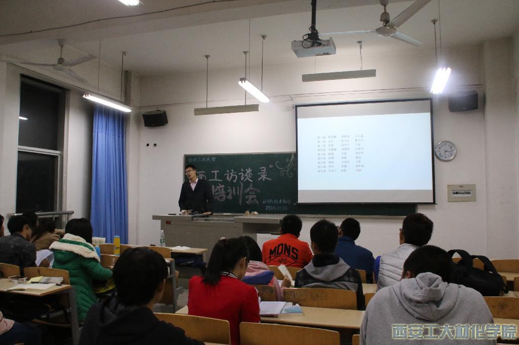 首先,科协记者部副部长刘海妮对参与访谈人员进行分组,从人物访谈进行培训,主要从以下方面进行了讲解:1、确定人物采访对象;2、选择采访方式;3、采访人物;4、访谈稿件的整理。然后,由科协记者部部长杨宁对访谈所遇到的问题进行了说明。紧接着,参加培训的人员分别与陕西科技大学新闻部部长阮昊、往届西工访谈录优秀采访者董芃凡以及科协主席高栋就访谈技巧及相关采访时注意的问题进行了交流。最后,由科协办公室主任张耀琪对稿件的整理及word排版展开了培训。