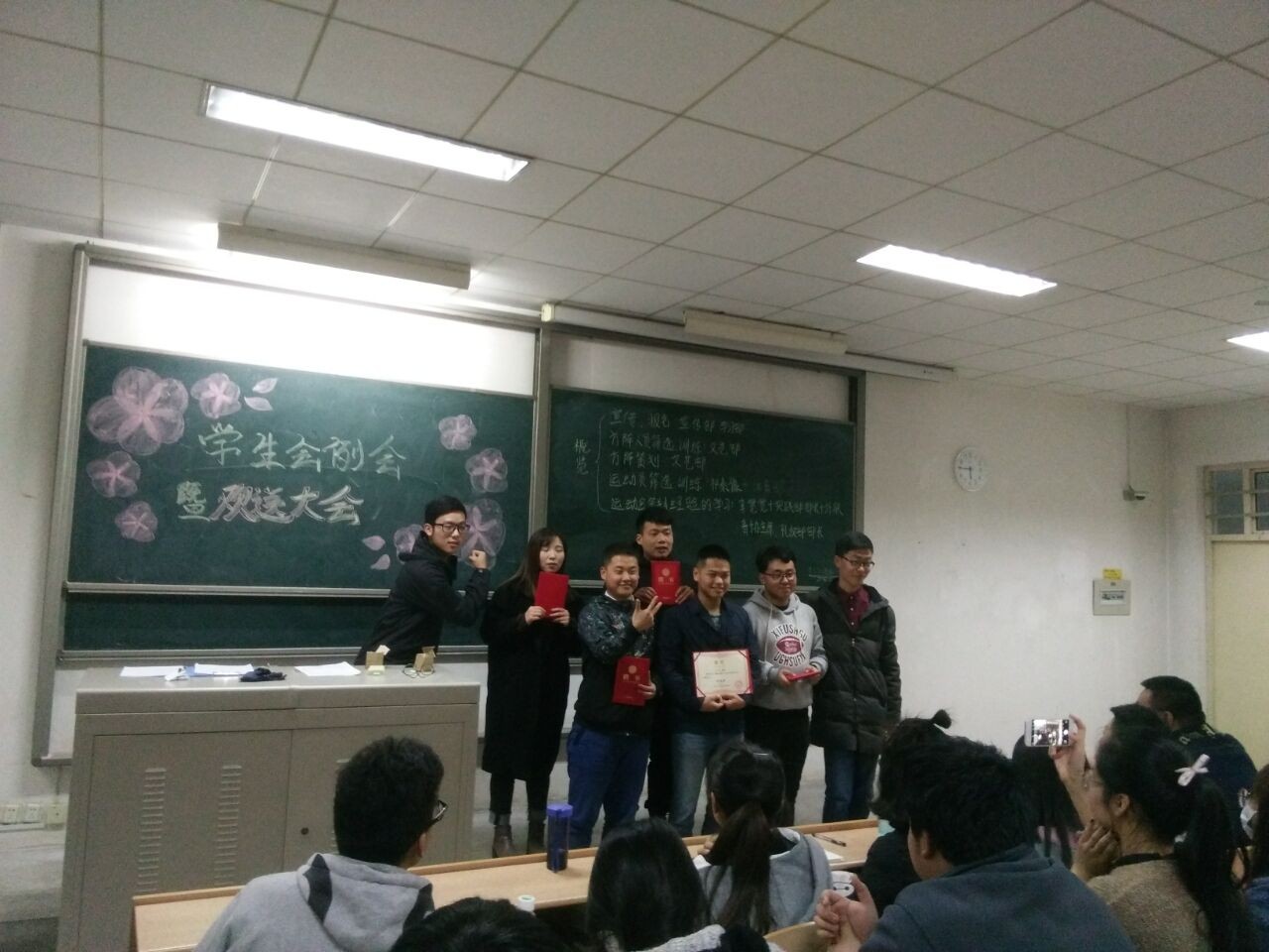 学生会的发展做出真挚的祝福。随后,原学生会主席团成员依次讲话,对学生会遗留存在的工作提出建议,他们同样祝愿学生会能得到更好的发展。讲话中,老主席们的不舍之情溢于言表。接着新任主席团一一发表任职感言并由两位新任副主席为上届主席团颁发聘书、荣誉证书及礼物。随即学生会召开例会,主席李宽宽与各部长及干事讨论对今后学生会的工作设想,围绕各部门的交流合作、制度建设、创新管理等几个方面,进行了深入的探讨,尤其认真研究关于我校春季运动会的工作安排,强调学生会成员要增强奉献精神和责任意识,指出学生会是一个团结的大家庭,要将学生会打造成团结一心、和谐进步的学生组织;在工作过程中,力求创新,包括活动形式创新和工作方式创新。学生会副主席祁秦豫以及副主席陈静远也对接下来的具体工作和学生会新职务的设置做了安排与阐述。最后,学生会例会暨欢送大会在热烈的掌声中落下帷幕。