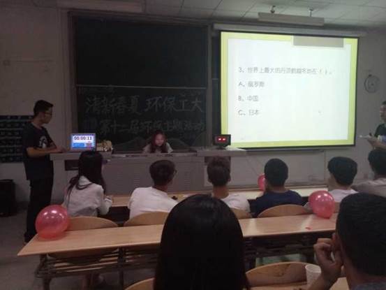 本次活动由办公室副部长张伟,张思雨主持。活动开始前,主持人宣布活动流程与比赛规则。比赛分为个人赛和团体赛,都要进行必答题和抢答题的环节以积累比分,最后进行整合统计评出优胜人员。比赛过程紧张而刺激,让观众们不禁佩服参赛人员丰富的知识储备;赛题内容涉及范围广泛,让同学们体会到环保与我们的生活息息相关,很好地达到提高大家环保意识的效果。除此之外,还有环保手工艺品的展示评比环节,参赛选手们充分利用废旧材料,对作品进行加工与美化,所呈上的作品匠心独具。最后,谭文波,吴翰丰,魏啸凯,周嘉妮等人在比赛中脱颖而出。主办方为获奖选手进行颁奖仪式,颁发奖状与奖品。至此,本次比赛圆满结束。