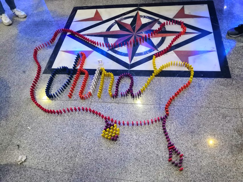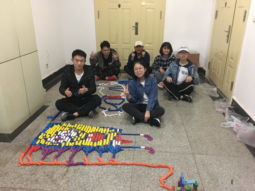 比赛前,所有参赛选手以抽签的方式进行分组并由工作人员记录分组情况。比赛开始,先由裁判员向所有选手宣读比赛规则。每一位同学都仔细聆听比赛规则,生怕错过任何一个细节,导致在比赛过程中出现失误。规则宣读后,各组队员在紧张而不失活跃的气氛中投入激烈的比赛。各组队伍的奇思妙想,一边竟然有序的摆放多米诺骨牌,一边体验着大家团结协作的快乐,最终在大家共同努力之下完成一个个精美的图案。尽管在摆放骨牌的过程中各组队伍都不时发生失误,但所有参赛队伍都不惧挫折坚持比赛,在数次坍塌与重建后,每个队伍都完成作品,最终比赛在一阵阵清脆的骨牌倒地声和欢呼声中圆满结束。