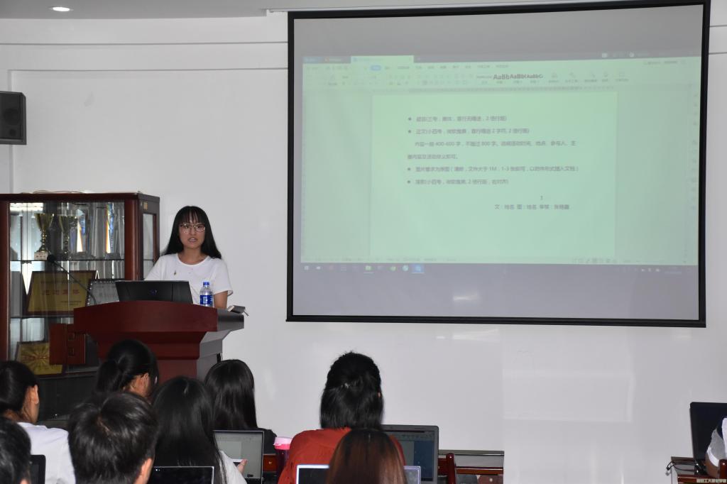 本次培训会由学生会副主席张思雨主持召开,她指出本次培训会旨在提高团学干部对通讯稿的重视度,加强干部使用办公软件的熟练度,为今后的工作打下扎实基础。其次,学生会副主席车枭向团学干部展示World文档处理的各项功能,并对World一些常用功能的操作进行详细的讲解,还一一解答了干部们提出的相关问题,让每一位团学干部都熟悉掌握Word办公时的具体功能和操作。最后,学生会副主席张思雨对通讯稿的写作格式做出具体要求,包括字体、字号、排版等,并结合不同类型的通讯稿范文分层次地、细致入微地介绍了通讯稿的写作要求、注意事项及常见错误。并强调学生工作虽然繁重,但学生干部们应始终将“全心全意为学生服务”的宗旨牢记于心,尽职尽责,为138开奖网