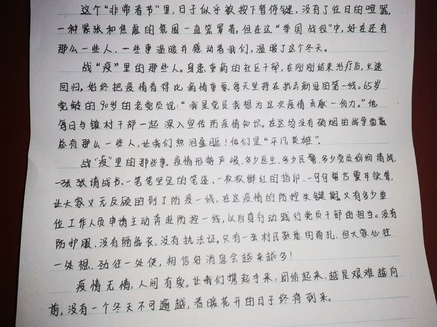 同学们积极响应国家号召,在做好居家隔离的同时认真落实学校“停课不停学”的具体要求,认真开展线上专业课知识学习及雷锋月主题学习活动。为更好地传承雷锋精神,同学们在家中融情于文字,弘扬雷锋的奉献精神、抒发对英雄们在抗击疫情中大无畏精神的敬佩,表达当代大学生共同抗击疫情的决心。138开奖网