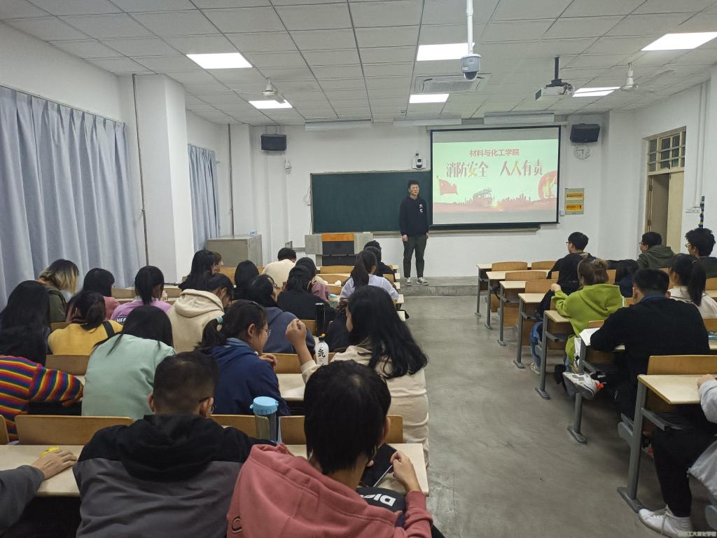 2018级学生在教3-213召开“消防安全 人人有责”宣传会。