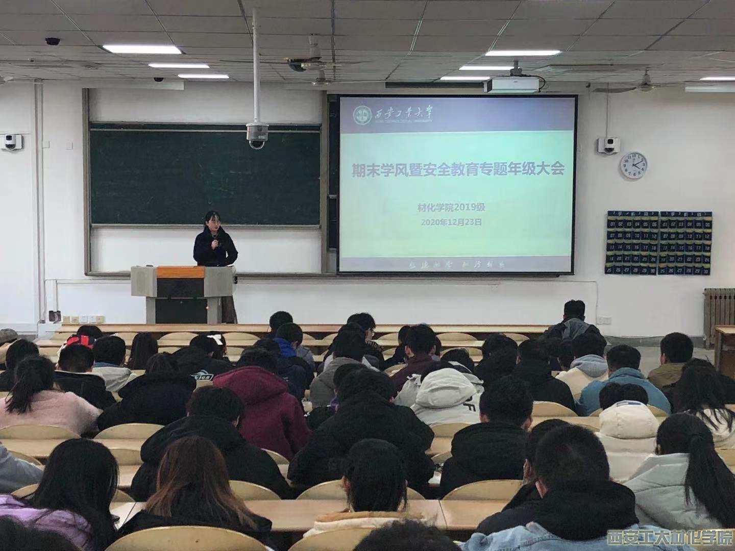 会上,辅导员徐慧子先后就假期安全、疫情防控、诚信考试、期末复习、冬季传染病预防等注意事项进行讲解和说明,督促同学们认真复习,诚信备考,保持良好心态,遵守考试纪律,并宣读《西安工业大学考场规则与考试纪律管理办法》。辅导员乔娜补充了几点内容:第一,对本学期的宿舍检查情况进行总结,强调做好宿舍清洁是校园疫情防控的重要环节,同学们要加强通风换气,保持良好干净舒适的宿舍环境;第二,针对疫情防控期间安全管理规定再次进行了强调,指出同学们应当始终保持警醒,重视疫情防控工作,维护学校教学生活秩序,做好健康防护,按要求佩戴口罩,遵循“非必要不外出”、“严守请假程序”,做好每日健康信息报送,落实晚归签到制度。第三,对离校事宜提出要求:离校前检查宿舍用电、用水安全,考试结束后尽快离校回家,离校途中要保持联系畅通,随时告知家长、辅导员行程安排,注意人身财产安全,并注重疫情个人防护。