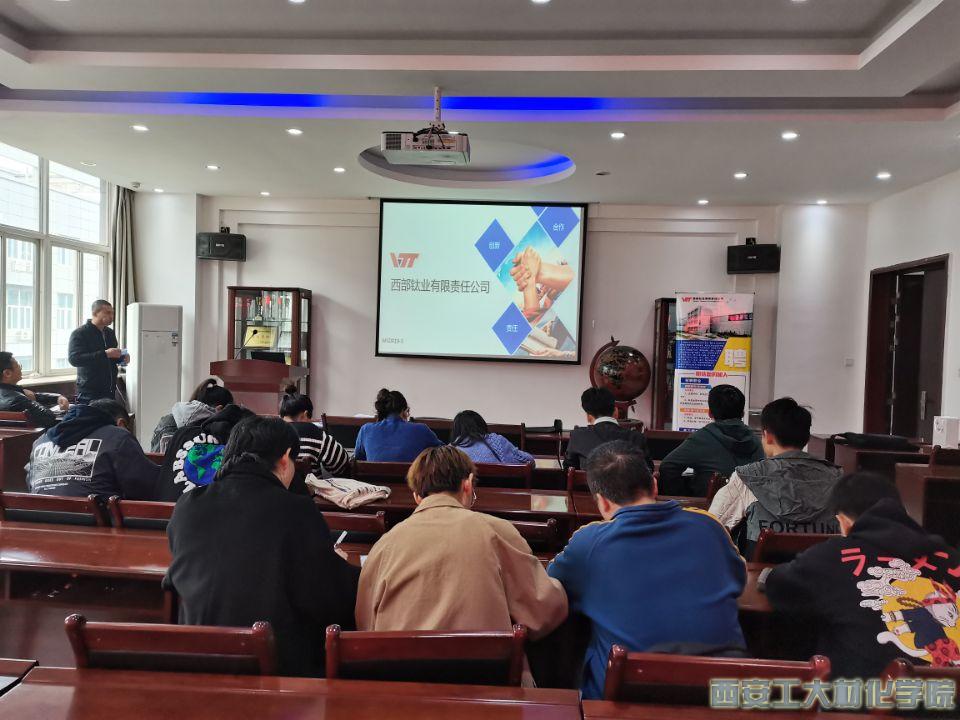 于2021年10月19日下午14:00在工3-404召开西部钛业有限公司宣讲会,人力资源人事相关工作人员,2018级辅导员张瑞红主持,2018级金属材料工程专业学生参加本次宣讲会。