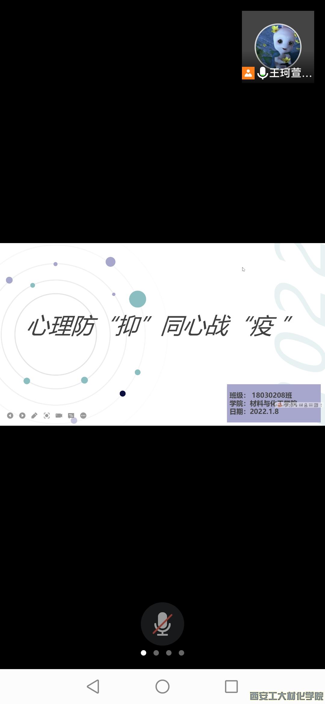 18030208班于2022年1月8日晚上20点在腾讯会议开展心理防“抑”,同心战“疫”线上主题班会活动,2018级辅导员张瑞红老师和18030208班全体同学参与此次活动。班会在辅导员张瑞红老师的指导和各个班委共同协调下顺利进行。