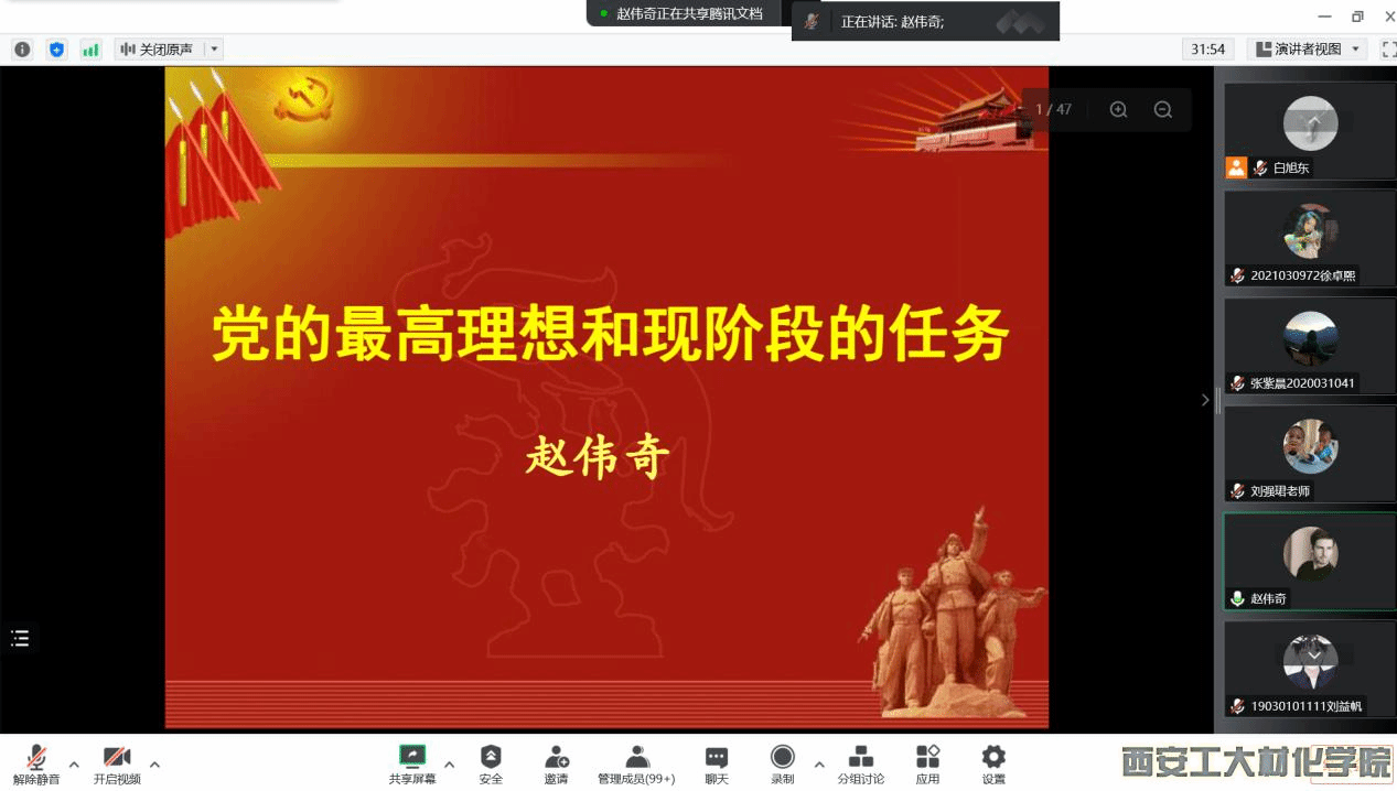 分党校于2022年11月3日开展以“党的最高理想和现阶段的任务”为主题的理论培训。本次培训由西安工业大学党委组织部赵伟奇老师主讲,培训班全体成员参会。
