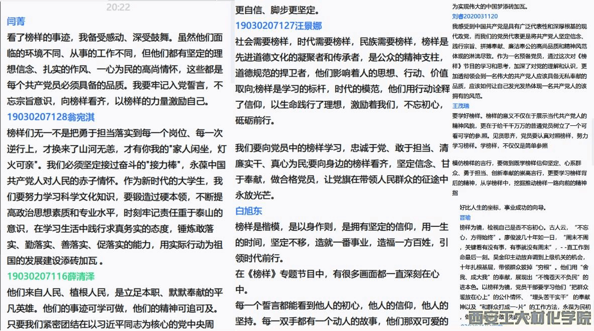 此次理论学习大会由副书记薛清泽主持。会议指出,节目中的榜样在平凡的岗位上践行着共产党员的初心和使命,在这片辽阔的祖国大地上闪耀着他们的熠熠光辉,将榜样的力量、优秀的品质深入每一位党员干部的内心。生动展现中国共产党人坚定信念、践行宗旨、拼搏奉献、廉洁奉公的高尚品质和精神风范,彰显基层党组织战斗堡垒作用和党员先锋模范作用,是开展党员教育培训的生动教材,深刻诠释中国共产党人不忘初心、牢记使命的执着坚守。学生党员刘京睿谈到:在新时代新征程上,广大党员以身边榜样为引领,坚定理想信念,传承革命传统,砥砺初心使命,时时处处发挥先锋模范作用,必将为全面建设社会主义现代化国家、实现中华民族伟大复兴中国梦贡献青春力量。学生党员闫菁谈到:要时刻使命引领担当,榜样传承精神,以行动响应时代的呼唤,从榜样身上汲取积极向上的力量。向先进学习、向榜样看齐、向优秀求教,我们要内化于心,外化于行,坚持“不忘初心、继续前进”。