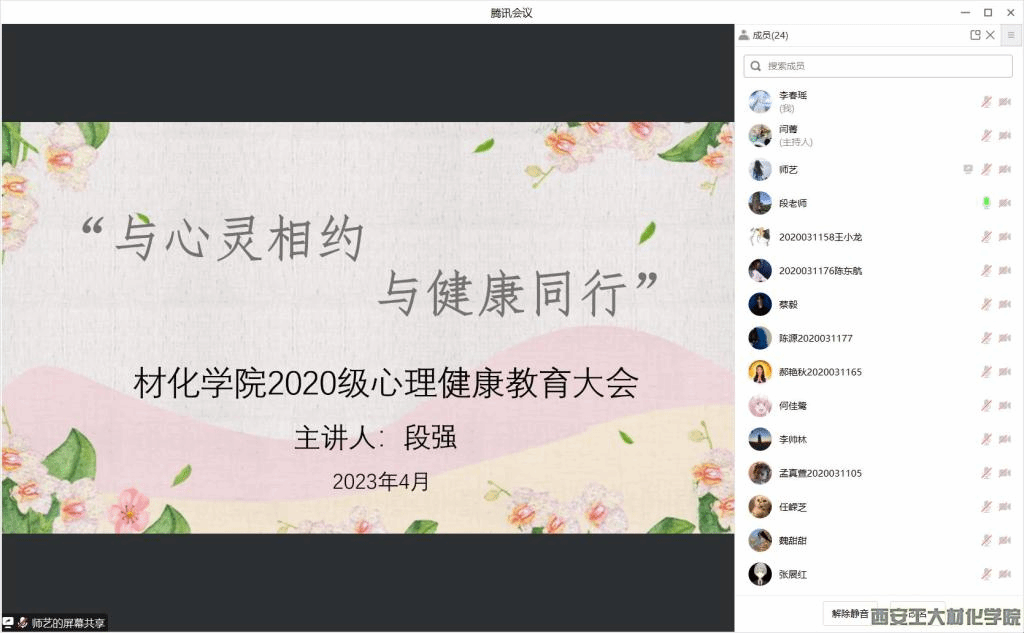 2020级于工3-404,召开全体学生安全教育大会,大会分为线上和线下同时进行。会议由辅导员段强主持。