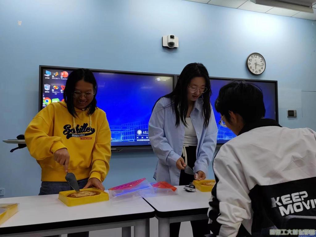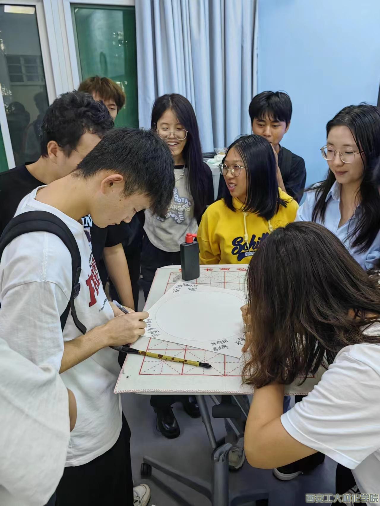会议伊始,中秋茶话会,辅导员张瑞红老师介绍了中秋节的由来以及历史演变,并就中秋节风俗,别称等问题对同学们进行提问抢答。其次,同学代表上台分切月饼,同学们围坐一起吃着月饼,大家畅所欲言,聊着自己的学习与生活。一声问候,两句细语,中秋茶会话洋溢着浓浓的情谊。最后,同学们积极参加骰子博饼、投壶及墨笔题名等活动,体验了一抹古老的艺术魅力。毛笔在纸上滑动的痕迹,勾勒出一个个独特而美丽的姓名,展示了同学们的文化底蕴和个性风采。