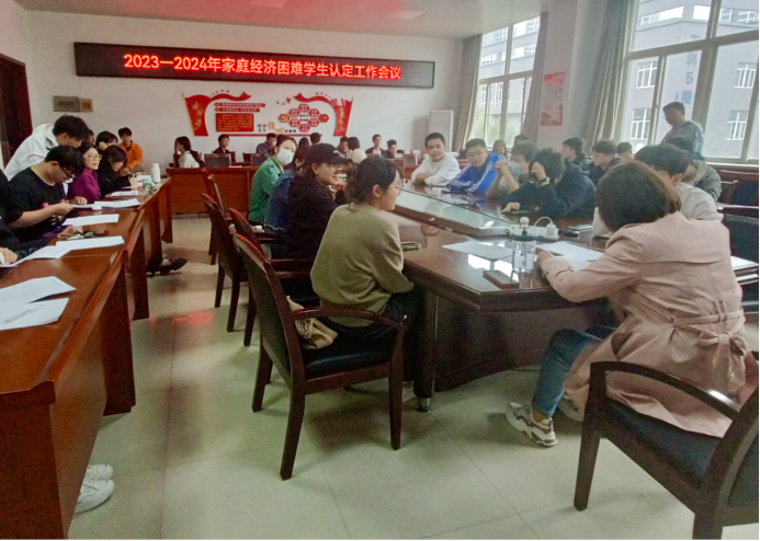 2021级近日在工三-410开展2023—2024学年家庭经济困难学生认定工作。会议由2021级辅导员刘强珺老师主持, 2021级各班评议小组全体成员参会。