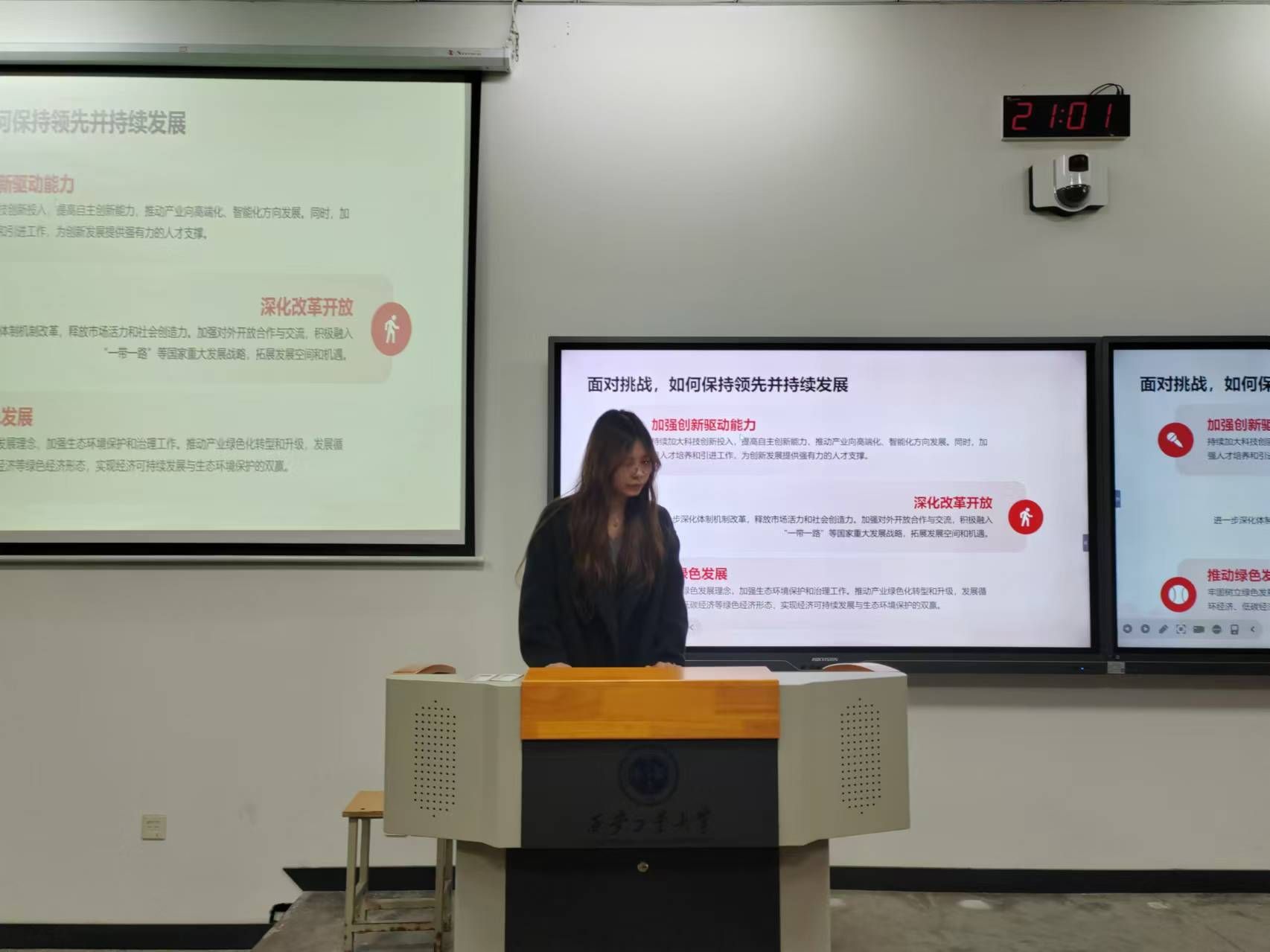 会议伊始,学生干部许淑敏从奋斗姿态的内涵与价值、深化改革创新的重要性与紧迫性、谱写陕西新篇章的战略布局与实践路径和陕西的机遇与挑战、以实际行动贡献青春力量五个方面进行展开论述,并举例说明当代大学生如何用自己的实际行动为祖国发展贡献青春力量,鼓励当代大学生积极行动。此次学习会议通过丰富的案例与详实的数据,深入分析了陕西在科技创新、产业升级、文化传承创新等领域面临的机遇与挑战,并详细解读了“争做西部示范”对于陕西发展的深远意义。