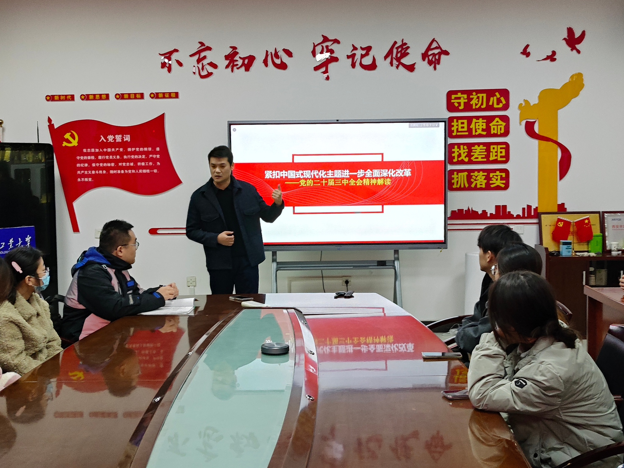 会上,段强带领大家回顾了召开党的二十届三中全会的重大意义和深远影响,并指出全会是在以中国式现代化全面推进强国建设、民族复兴伟业的关键时期召开的一次十分重要的会议。学习过程中,段强与全体党员深入学习《中共中央关于进一步全面深化改革、推进中国式现代化的决定》相关内容,带领大家了解核心要义和精神实质。讨论环节中,支部党员亢林田谈到:要坚持学以致用,把学习贯彻全会精神与做好本职工作紧密结合起来,真正做到互相促进、务求实效;党员王雨婵表示在今后要充实理论知识学习,并与实践活动有效结合起来,提升自身的综合素质,将来为社会的发展积极贡献力量。随后,段强以“你若盛开 清风自来”优秀学生党员能力养成为题,从树立正确三观、提升综合素质、培养创新能力、加强党性修养四个方面开展党课教育,并强调全体党员要筑牢政治忠诚、强化责任担当,深刻领悟“两个确立”的决定性意义,增强“四个意识”、坚定“四个自信”、做到“两个维护”,要始终站在时代前列,保持一名共产党员的先进性和模范性。