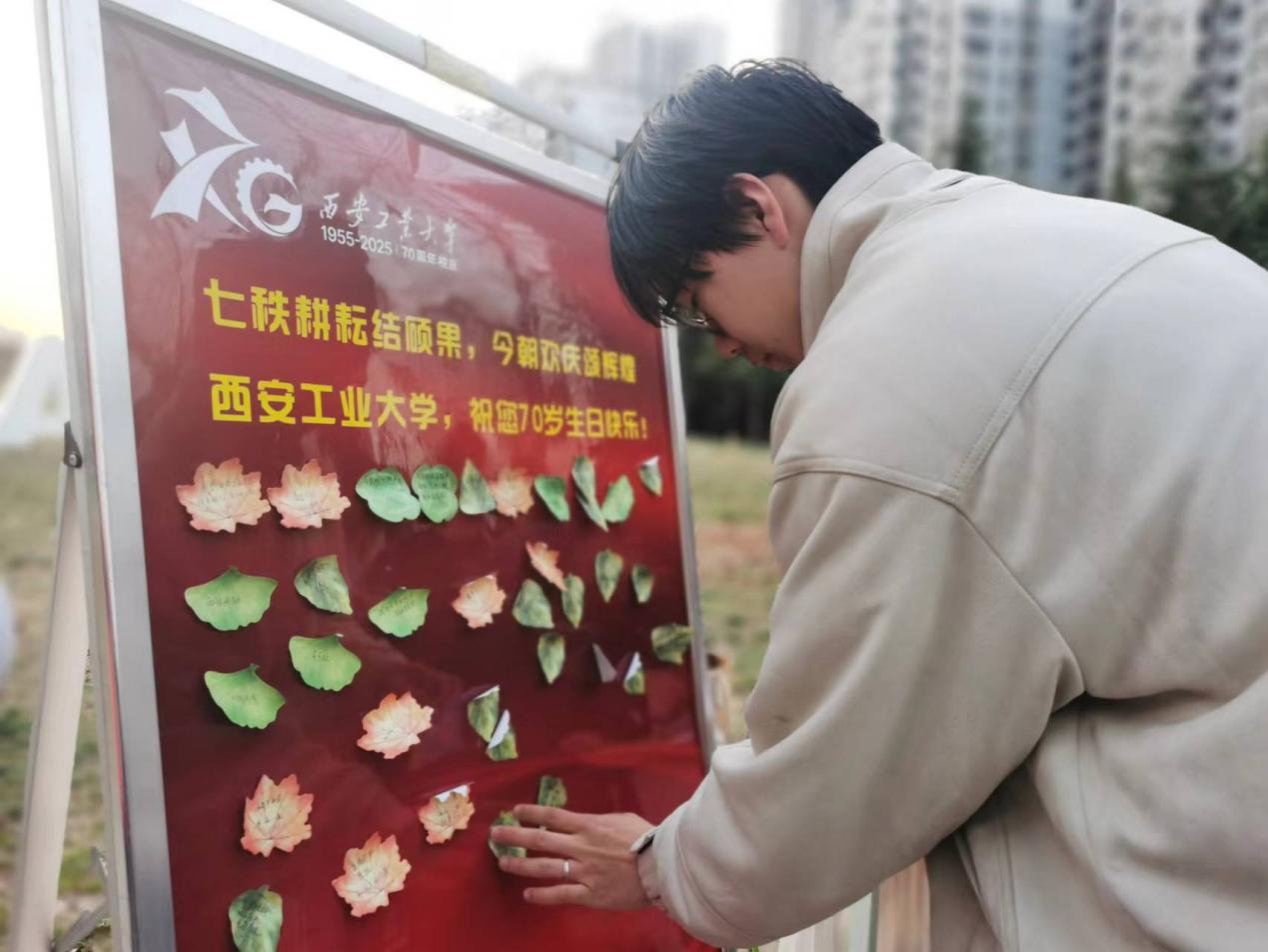 于“I LOVE XATU”标志之侧,“心愿便利贴”活动温情启幕。同学们热情高涨,在回答校史知识问题的同时,纷纷拿起笔,将对校庆的诚挚祝福和对未来的美好憧憬凝于笔尖,书写在便利贴上。一张张五彩斑斓的便利贴,承载着对母校深沉的眷恋与祝福,也寄托着同学们独一无二的个人期许。随着时光缓缓流淌,越来越多的便利贴如雪花般轻轻飘落,稳稳贴在展板之上。没多久,原本简洁的展板已然贴满密密麻麻的便利贴,它们相互交织、彼此映衬,共同汇聚成一面饱含深情、温暖人心的“心愿墙”,成为校园里一道独特且动人的风景线,诉说着同学们与母校的深厚情谊。