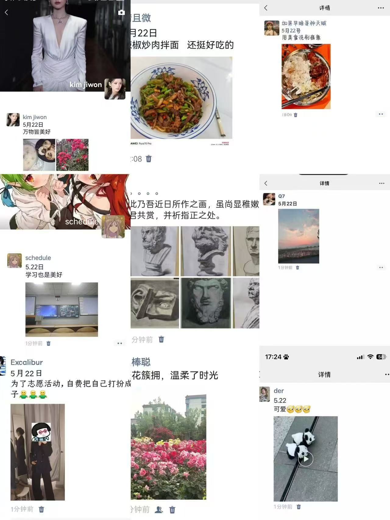 活动以“心打卡”为主题,鼓励学生每日在朋友圈发布一张记录生活美好瞬间的照片或文字,内容涵盖校园风景、学习日常、友情互动等,形式灵活且注重隐私保护。许多同学通过镜头展现了独特的视角:有的记录清晨图书馆的阳光洒在书本上的静谧,有的分享与室友共同完成实验的喜悦,还有的捕捉到校园樱花树下偶遇的温馨场景。这些瞬间不仅成为个人成长的印记,更通过社交平台形成“幸福接力”,潜移默化中缓解了学业压力,增强了心理韧性。