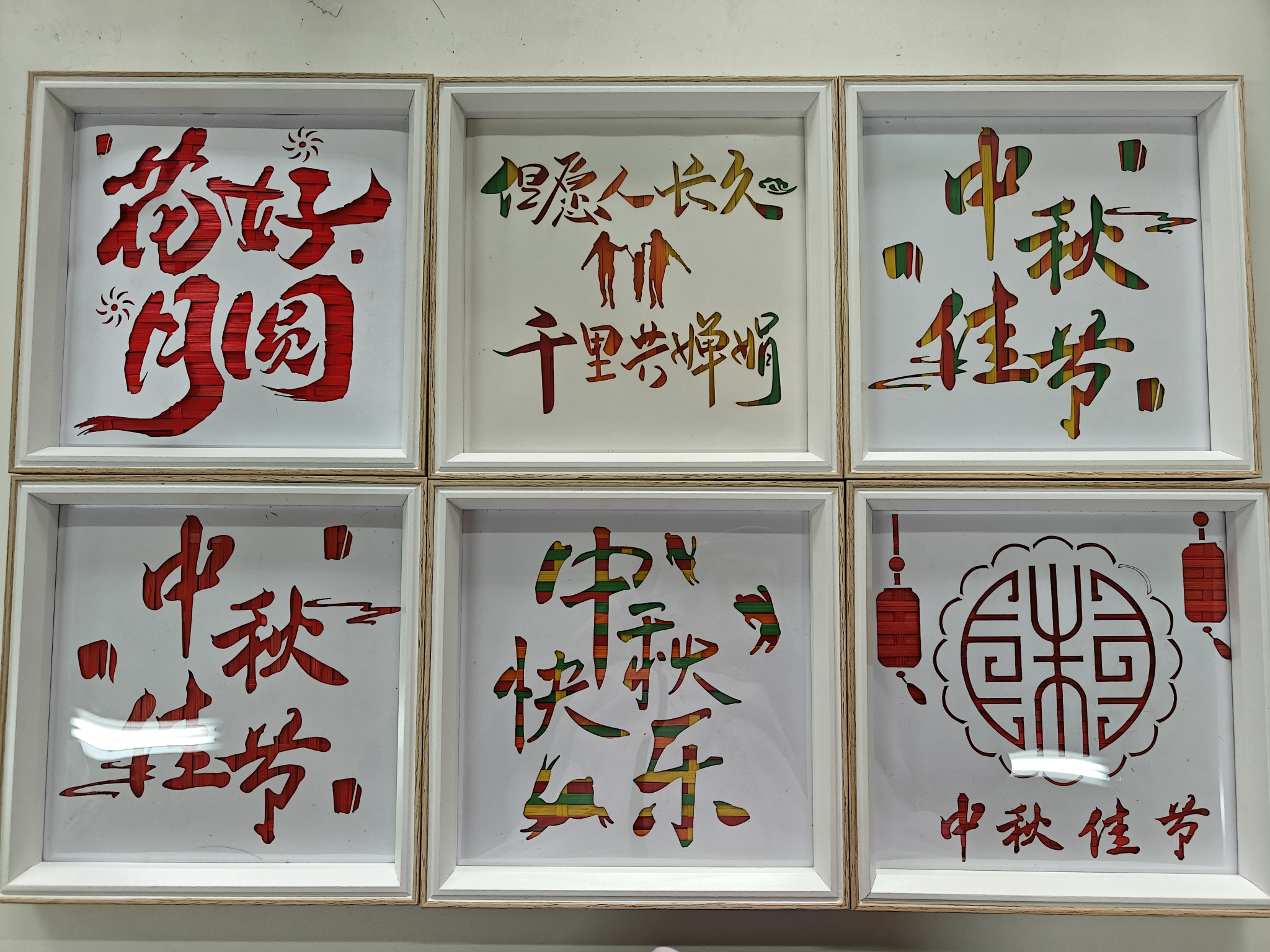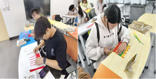 为同学们精心准备了竹编画手工材料包,其中包含竹篾、底板、胶水等工具,以及带有中秋“玉兔桂树”、国庆“红韵福字”等主题元素的创作模板。拿到材料包后,同学们迅速投入创作,通过疏密交织的编织手法,既体现了国庆的喜庆氛围,又传递了对家国的美好祝愿。创作过程中,同学们不时相互交流编织技巧,遇到难题时主动向身边同学请教,现场氛围热烈而融洽,每一根竹篾的穿梭,都凝聚着大家对传统文化的热爱与对双节的期待。