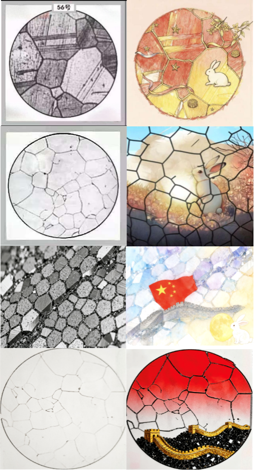 大赛以真实金相组织图谱为创作根基,划定“保留原有结构、融入国庆元素”的创作准则,让A4纸成为专业知识与家国情怀的交融舞台。参赛学子们将国旗的鲜红、长城的雄浑、玉兔的灵动,通过细腻涂色技巧嵌入金相微观世界:以“枝晶结构”为底,勾勒长城蜿蜒的轮廓;借“相界纹理”为布,晕染国旗的璀璨;将“玉兔”形象与金相形貌融合,让传统意象与科技纹理碰撞出独特火花。每一幅作品的创作过程,都是一次沉浸式的专业学习——学子们需精准辨识金相组织特征、熟练掌握结构呈现技巧,在艺术创作中夯实了《材料科学基础》等核心课程的理论功底。