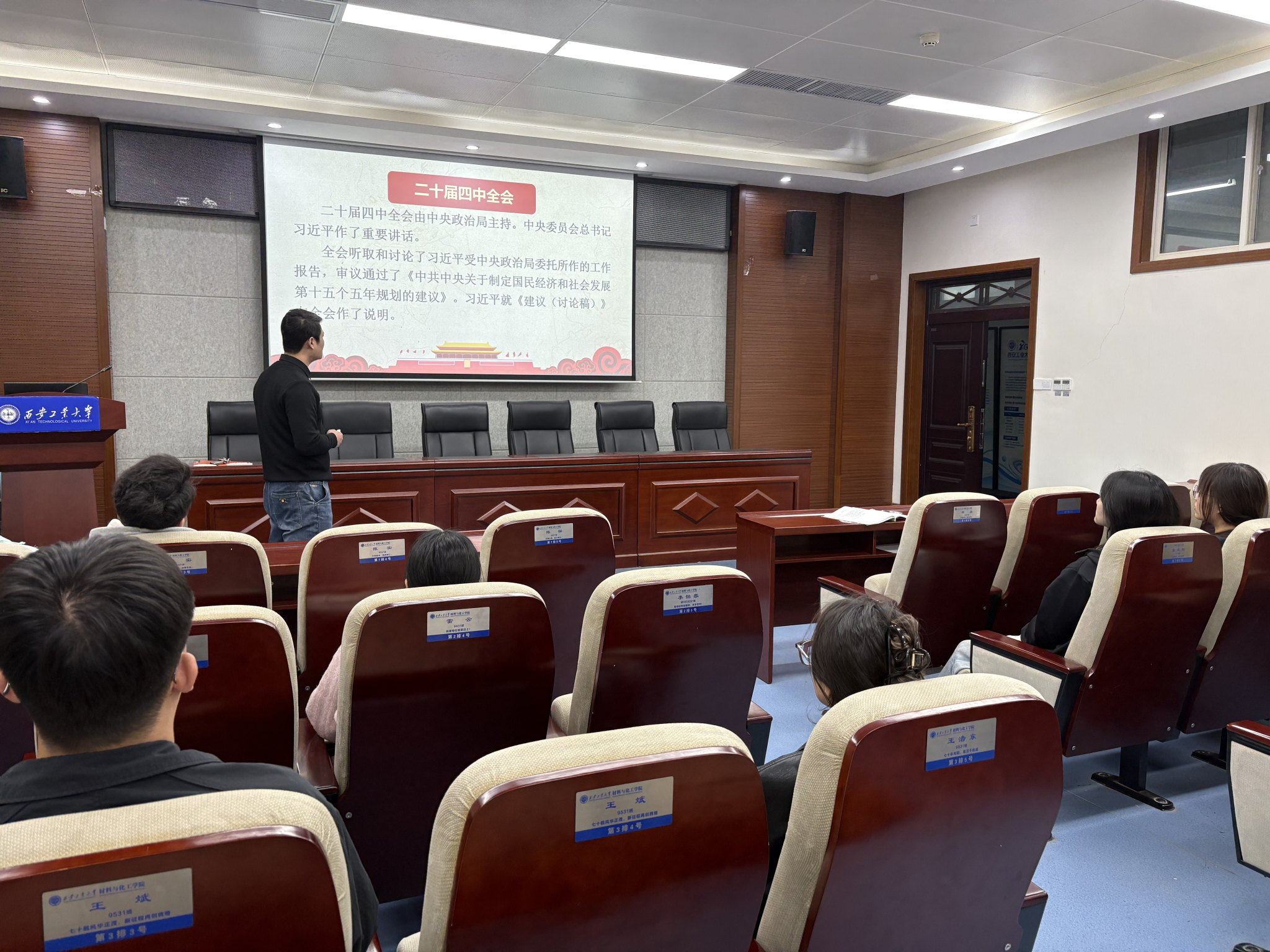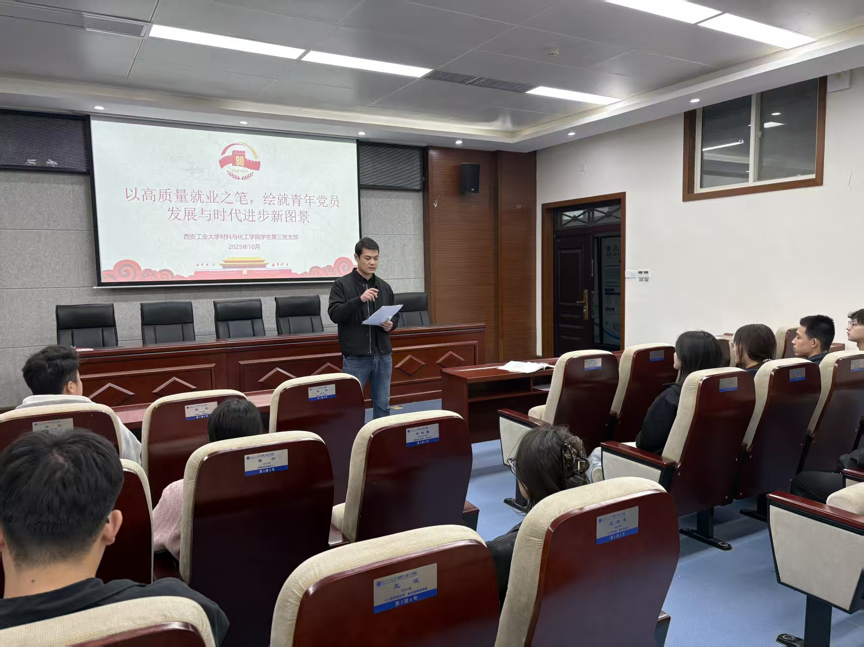 学生第三党支部围绕“以高质量就业之笔,绘就青年党员发展与时代进步新图景”为主题讲授党课,并集中学习党的二十届四中全会精神,全体学生党员参加。