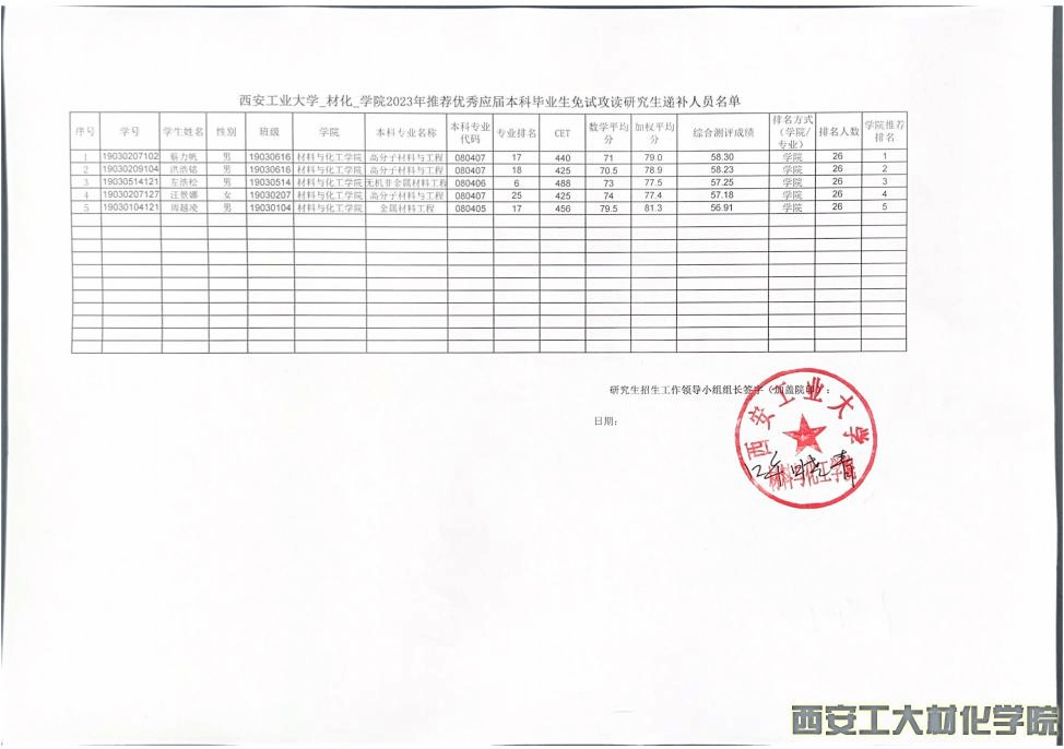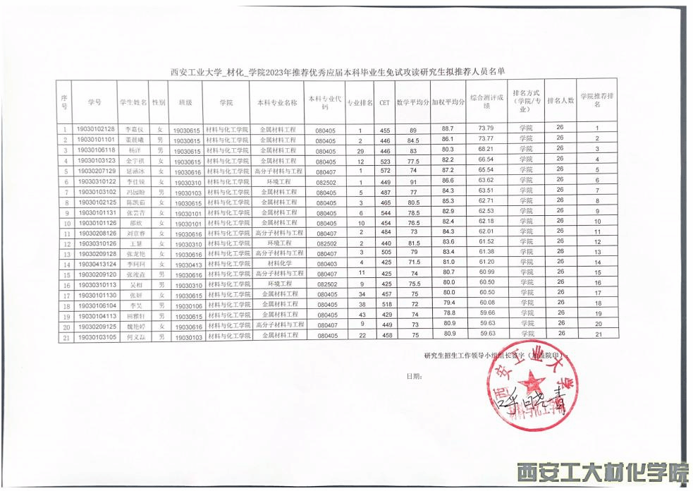 按照《西安工业大学推荐(接收)优秀应届本科毕业生免试攻读研究生实施办法(修订)》及《2023年138开奖网 推荐西安工业大学应届本科毕业生免试攻读硕士学位实施细则》,现将138开奖网 2023年推荐优秀应届本科毕业生免试攻读研究生拟推荐人员名单和递补名单予以公示,公示期为2022年9月17日-23日。如有异议,请于2022年9月23日18时前实名向138开奖网 联系人反馈,联系人:胡娜 联系电话:029-86173324。