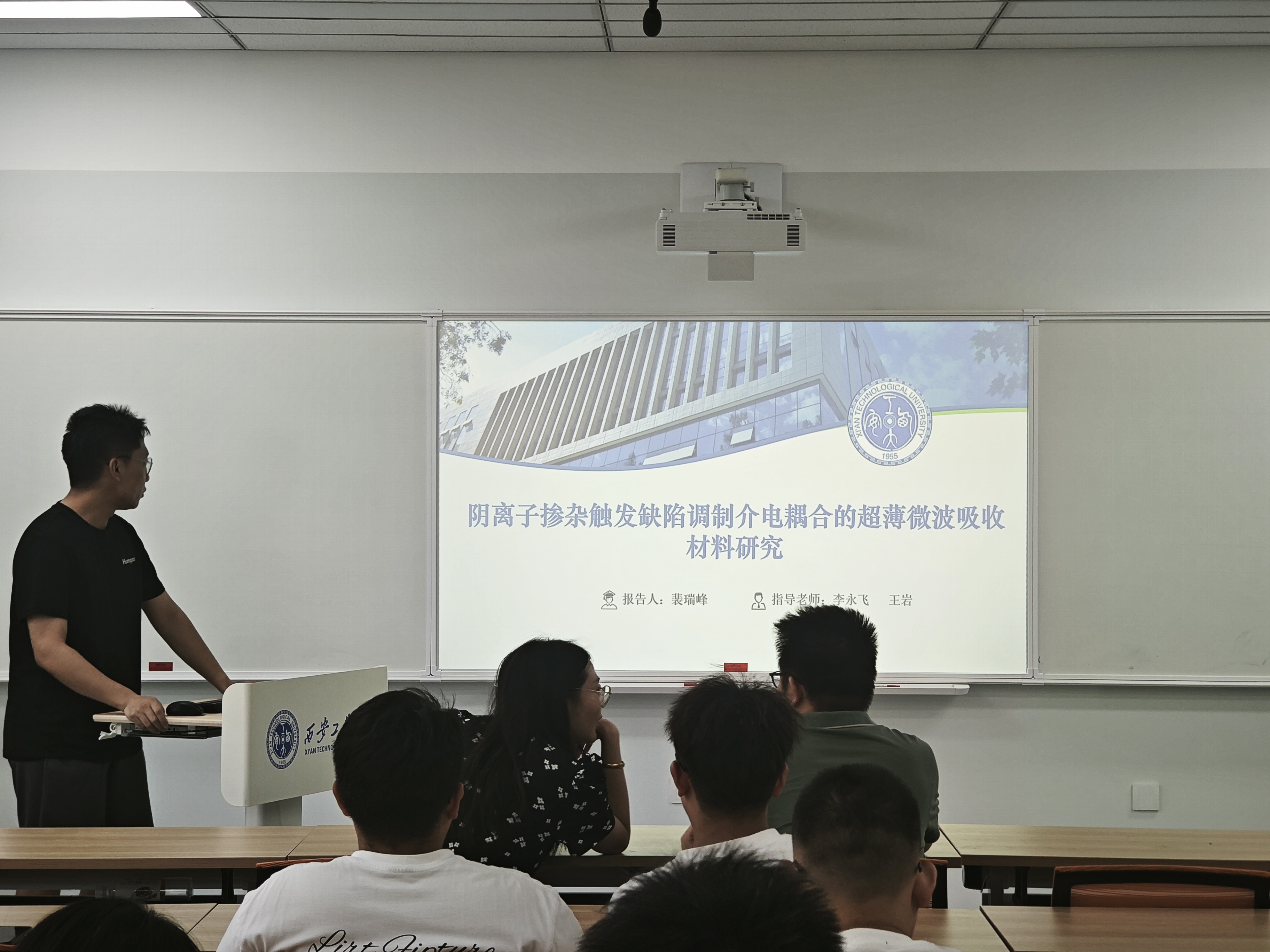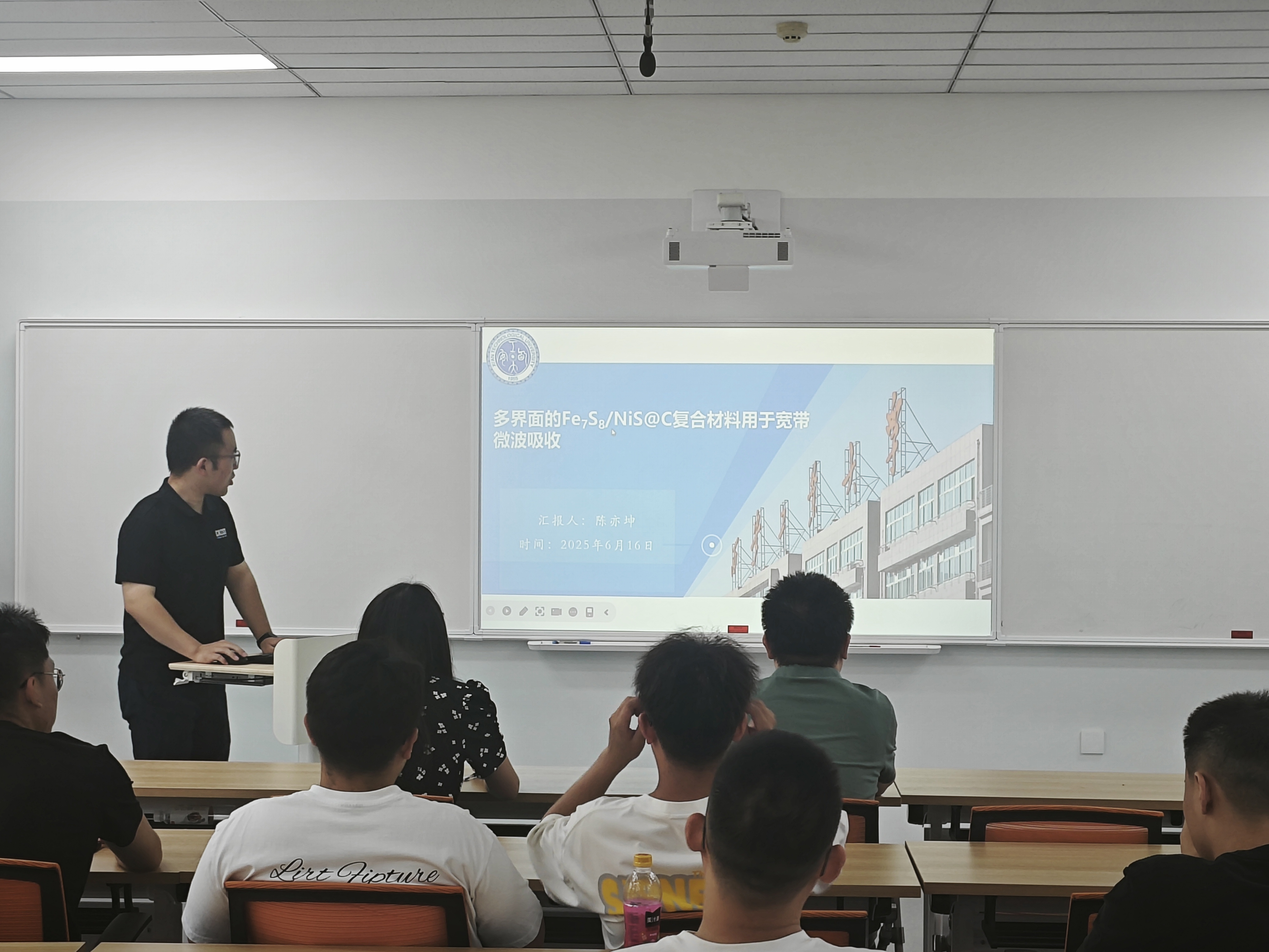 学术分享环节中,四位优秀的硕士生代表依次带来精彩的学术分享。陈亦坤同学以“多界面的Fe7S8/NiS@C复合材料用于宽带微波吸收”为题,分享了MOFs衍生材料在微波吸收领域的创新成果;裴瑞峰同学围绕“阴离子掺杂触发缺陷调制介电耦合的超薄微波吸收材料研究”,探讨生物质基材料的独特性能与应用潜力;王博洋同学就“多功能轻质磁性纤维素基气凝胶的集成设计:用于高效微波吸收的1D/2D/3D分层网络”,介绍纤维素基复合材料的制备及吸波性能;饶辉超同学以“通过自分解策略调控银耳状多维异质结构的电磁响应能力”为主题,阐述MXene基复合材料的微结构设计与吸波性能优化。