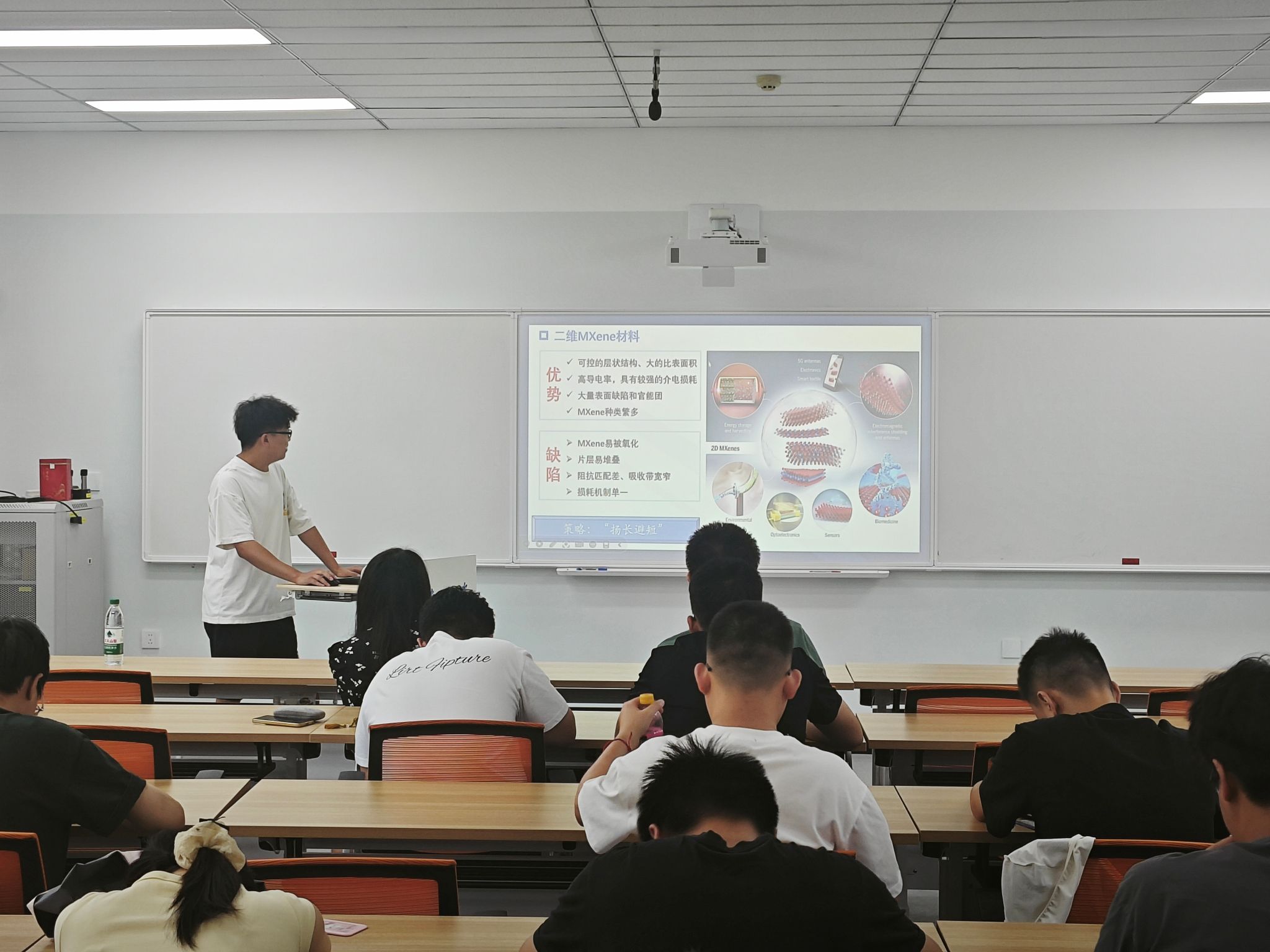学术探讨环节中,王岩老师对同学们的研究成果给予高度评价,充分肯定了其创新性与应用前景,同时也提出了进一步优化的方向,为后续研究指明路径;闫婧老师从材料设计与性能提升的专业角度出发,为同学们提供了宝贵的学术建议。两位老师还鼓励同学们持续深耕科研领域,积极参与各类学术交流活动,不断拓宽学术视野,提升科研水平。